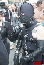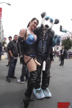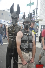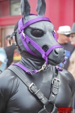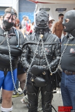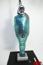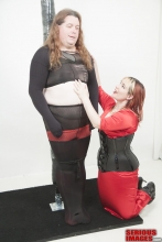 The name 'Gingerbread Board' was coined after we noticed that the board looked like a Gingerbread Man cookie you see around Christmas time. The board itself was made by having SubMissAnn lie down on a piece of plywood. Dalton traced around her body with a sharpie pin, cut out the silhouette with a jigsaw, then covered the cutout with foam padding and red naugahyde fabric. That's why the red Gingerbread looks roughly like the size of SubMissAnn. Once the Gingerbread was finished Dalton attached vertical pipes to the back of the board to hold it up and off the floor. As you can see, these pipe legs worked out pretty well. Since we're in the bondage website business we had plenty of black leather straps to restrain SubMissAnn. I must say, once Dalton applied all the straps, a pair of lockable leather helpless mitts and a blindfold to her SubMissAnn's naked body, she sure looked great. Black leather bondage on this red Gingerbread Board took this scene over the top. The only thing missing was a pair of black leather boots.