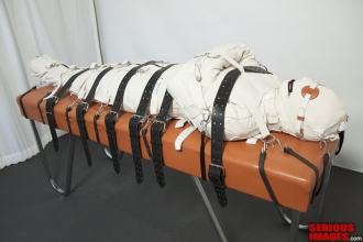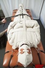 Ashley Renee wears a ball gag like no one else. This time she writhes around in a petite size one of a kind leather sleepsack. Her struggles began as model play acting, but soon they became genuine. When she was released she was noticeably aroused from the experience as were we all. However there is no release for the wicked or is that relief. Either way she was soon in more bondage.