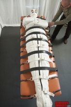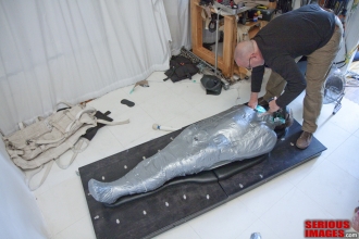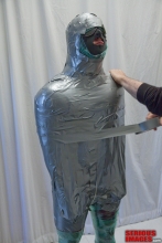 We had talked on line for several weeks about his visit. He has been here before and had a good time. I knew he was into mummification and very heavy bondage so I thought I would do both. Duct tape is a simple thing and effective but it can be very strong and stiff in layers. I used four large rolls plus plastic pallet wrap to make an almost cast like mummification. I incorporated a posture collar and taped his fingers with electrical tape. Each limb was wrapped and taped separately. The arms were covered with the sticky side of the tape out to test a new idea I had. As the arms were pressed to the sides and covered with several more layers, I think this was even more secure, but it was hard to tell. He wasn't going anywhere. A great time was had by all.