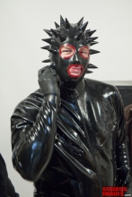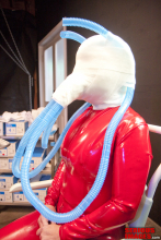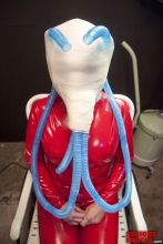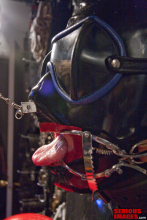 We gathered our crew with some great new gear. Our friend Mode Nard was fresh from BoundCon in Munich Germany with an alien looking rubber hood, nose hook from Axsmar, and metal spider gag. Our Vac-Cube was powered by an industrial vacuum cleaner which was located outside the house some 40 feet away. This industrial vacuum created an extra powerful suction and since it was outside we could leave it on without a noise problem. Mode Nard began with a full rubber catsuit. This made it a double layer scene which is what rubber is all about. The play is fun throughout this video. By the way, this time we didn't forget a tongue clip this time. A special thanks to Mistress Susan for harassing Mode Narr in such evil ways - he enjoyed every minute of it. And thanks to Rage Rubber for supplying the cool latex Vac-Cube.