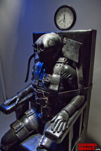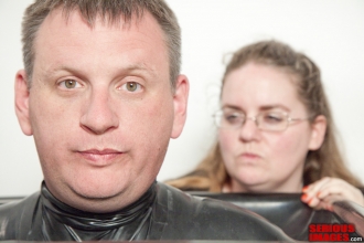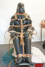 We had a very toppy lady visit the SeriousBondage Institute who could not picture herself in some of our more serious bondage gear because she was claustrophobic. This didn't stop us from coaxing her into the famous serious bondage chair. It's just a chair with a few straps we told her, with a smile. The latex cat suit was her idea, so we went for a full coverage look with latex gloves and a very rare rubber alien hood. I encouraged her to try it all, and soon she was at ease enough to get strapped in. After she was secured and comfortable, I sensed some anxiousness. To distract her I used some Hitachi therapy, in fact I used it twice. Later she said she forgot all about being claustrophobic.
