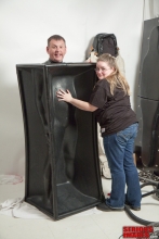 Our friend MummyEd had another birthday recently; it seems like just a year ago that he had his last one. To help with the celebration Ed invited his lady friend from up north to join us, and to simulate a birthday cake we threw her into a unique standing latex vac-cube we had borrowed for the occasion. Once the cube was sucked down she did a lot of giggling and squirming (with the help of some ice), and sang happy birthday to Ed which was quite amusing in her latex-clad predicament. Then it was Ed's turn to get sucked down, and he was forced to count 40 swats on his ass to compensate his friend for the prior ice cube treatment. All in all, a fantastic birthday experience! A special thanks to Rage Rubber for supplying the cool latex Vac-Cube.
