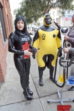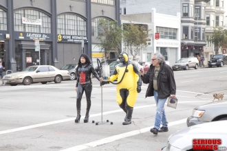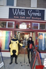 San Francisco is a kink friendly town. Serious Bondage has a great time doing scenes in the streets. People here are curious and friendly, they usually greet us with a smile. The same area where Dore Alley and the Folsom Street Fair bring out the fetish ware is very welcoming year round. This is also where Wicked Grounds is located. We spend a few hours meeting several of the local kinksters. Davina Darling was charming a young man and Cleo Dubois on her way to a piecing class stop by. Mistress Gwen thoroughly enjoyed this welcoming atmosphere.