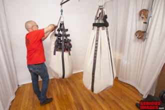 The coolest dungeon is hidden in a secret room in a beautiful home nestled in the suburbs of Sacramento. The use of industrial extruded aluminum called 80/20 makes this a high tech dream space. The owner of this space gives a detailed explanation as Mark and BondageRoadie look on. The split bench seat is a powerful toy, I can speak for it personally.