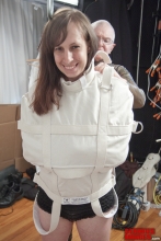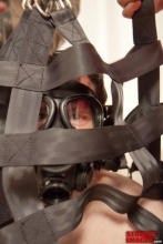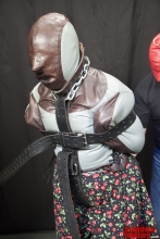 Doctor Mad Max makes some very unique gear. He has taken the recreational straitjacket to a new standard. It is tough, secure, and inescapable. These pieces are his version of the mail bag. These tough canvas bags with welded D rings will hold a ton. After strapping one subject in an inside out jacket we put her in the closed bag. The other see through model holds its subject securely watching and waiting for what will happen next. The mitts are a prototype that will not be manufactured.