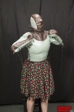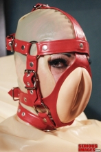 This could easily be the most bizarre video we have shot in a long time. Reminiscent of Alice in Wonderland, Mistress Eve Minax takes us down the rabbit hole into her own private world of rubber, bondage and transformation. Whether you have eaten a magic mushroom or not, you will struggle to make sense of Minax's delightful interaction with her rubber ‘Leapshe’ and the crazy time they spend together. This video is not to be missed. If you have been looking for a quality west coast Mistress, check out San Francisco’s own MistressMinax.com. Other videos of Eve Minax can be found on this website. Rubber hoods from StudioGum and RubbersFinest - notice the rubber tongue and teeth in the photo above!