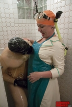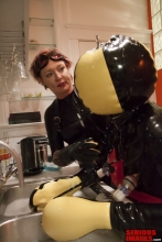 Susan takes ModeNarr through his paces during a party at SBI. The playful and sarcastic style of Susan is a joy to watch. ModeNarr is a rubber fetishist with some extreme gear. The blow up hood amplifies the outside noise so this make the scene even more intense.